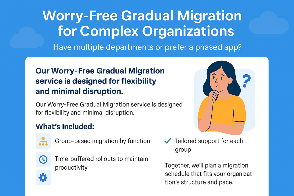 ✅ Group-Based Migration. We segment the migration process by department, function, or location, ensuring each group transitions at the right time, with the right support.