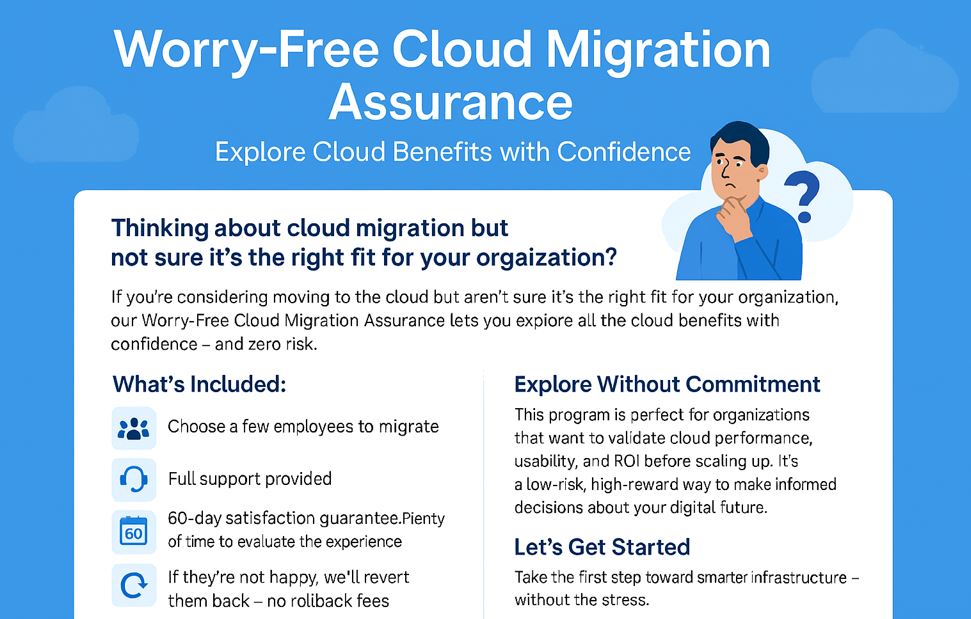 Our Worry-Free Cloud Migration Assurance program is designed to help you explore the benefits of cloud technology with complete confidence and zero risk. Whether you’re concerned about compatibility, performance, or user experience, we provide a safe and supported way to test the waters before making a full commitment.